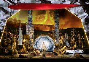 De romantiek van het werk gaat nooit verloren in deze ultrahedendaagse vormgeving. Het woud, de bron, het wandern: de thema’s zijn overvloedig aanwezig in woord én in beeld, in dit mystieke verhaal dat draait rond de drievuldigheid van de schaal, de beker en de speer. Wagner, die niet alleen de muziek schreef, maar ook de Dichtung, kreeg van tijdgenoten, NIetschze onder andere, de kritiek dat hij de Christelijke symboliek te veel op Parsifal projecteerde, voor eigen gewin. Die ciritici hebben een punt. Het ligt er wel heel dik op. Maar Wagner hield zich al langer bezig met religie en metafysica, niet alleen met het christendom, ook met boeddhisme, schopenhauerianisme en diverse mystieke stromingen. Parsifals verlossing door medelijden is niet alleen een Christelijk uitgangspunt, ook Schopenhauer – wiens invloed hij onderging – zag medelijden als het hoogste morele goed. Dit alles werkte in op dit uitermate indrukwekkende geestelijke testament.