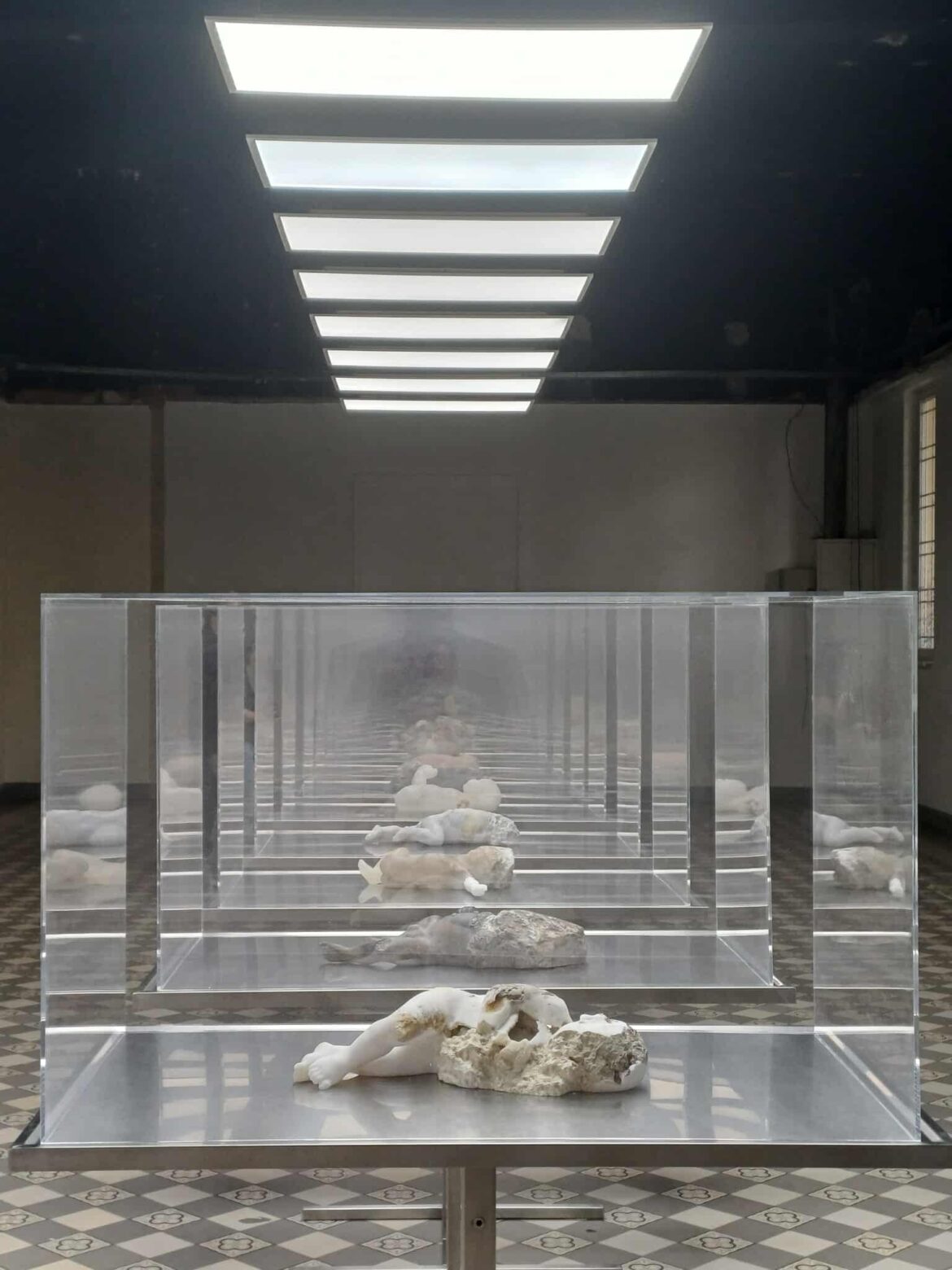 Wat zien we? Aanvankelijk zeven, nu tien, baby’s in albast, gelegen op een steriele inox tafel. Die tafels genereren een heel dubbel en ongemakkelijk gevoel. De glazen vitrines erbovenop versterken dat. Verwijzen ze naar couveuses of is alle hulp te laat en zijn de baby’s overleden? Muller stelt de vraag hoever we kunnen gaan in onze zoektocht naar het perfecte kind, in een samenleving waarin evolutie, technologie en genetische manipulatie een steeds grotere rol spelen. Zij liet zich daarvoor inspireren door een boek van Petra De Sutter, professor reproductieve geneeskunde. Beiden kenden elkaar niet maar alletwee stelden ze zich vragen bij de ethische grenzen van de huidige voortplantingstechnologie. Negen van de bijna doorschijnende baby’s vertonen onvolmaaktheden, vergroeiingen – dikwijls organisch vanuit de broze materie. Eentje slechts lijkt volmaakt.